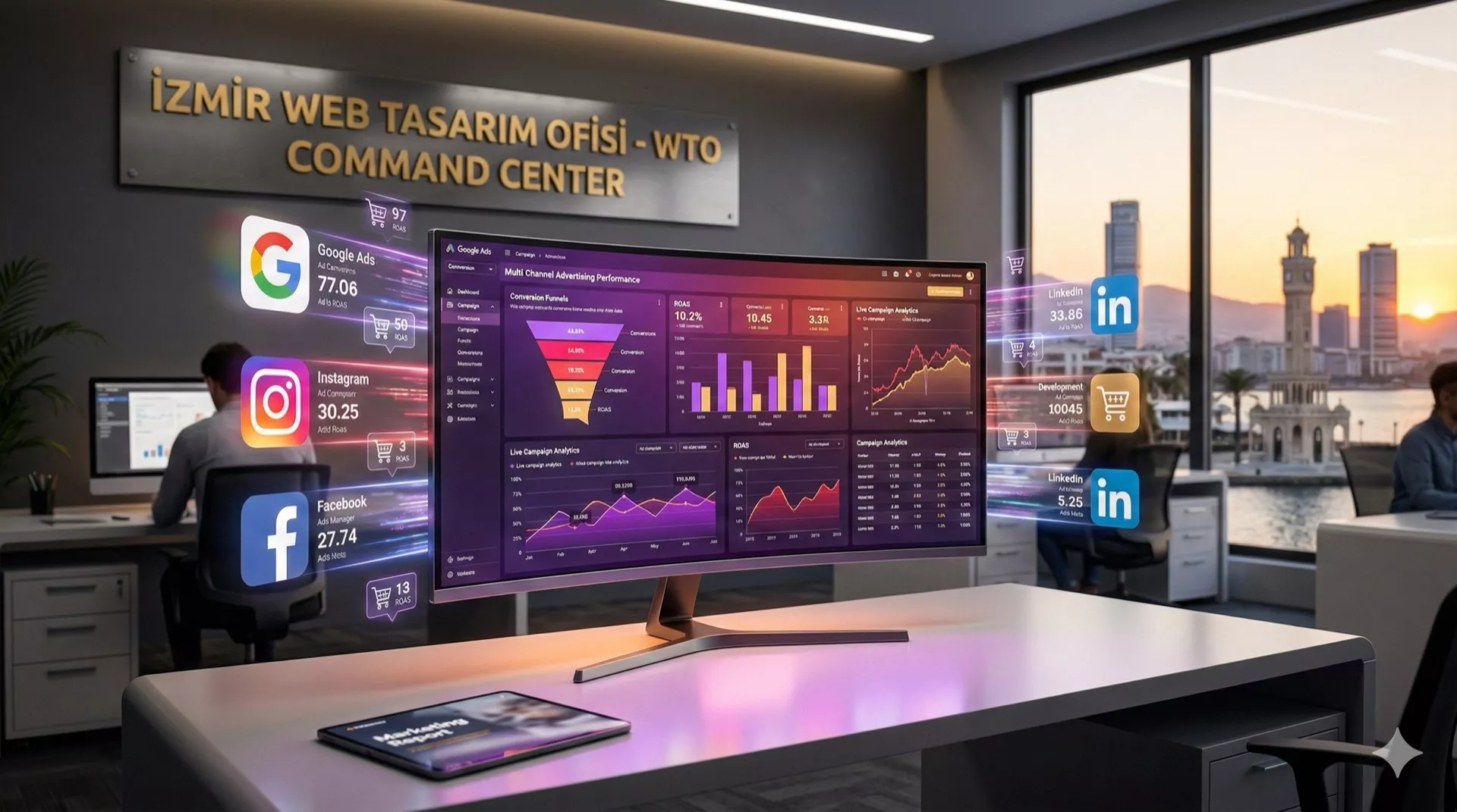 İzmir Web Tasarım Ofisi kurumsal SEO ajansı ortamında, organik büyüme grafiklerini ve teknik optimizasyon verilerini gösteren analiz ekranı.